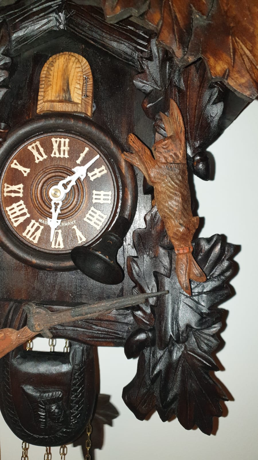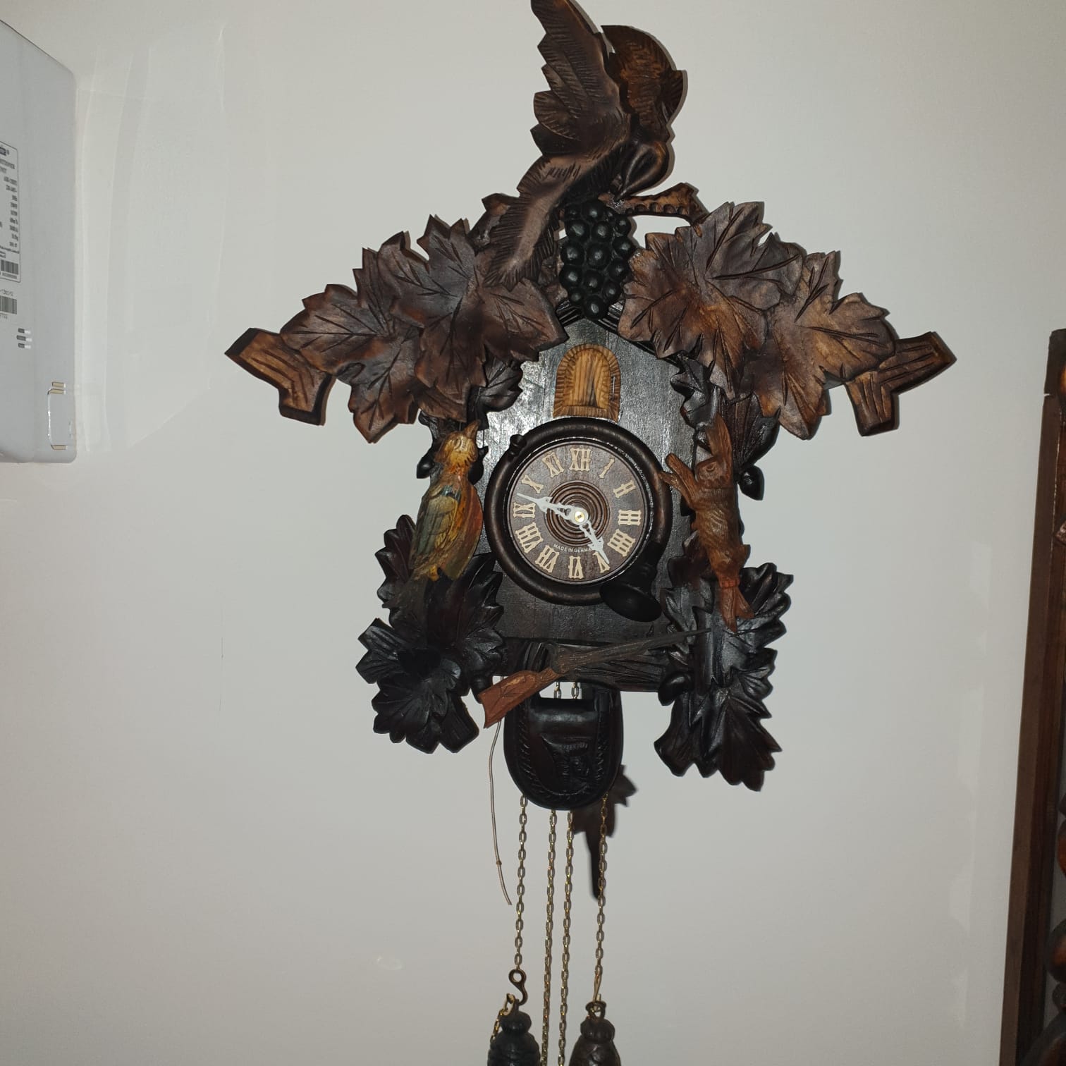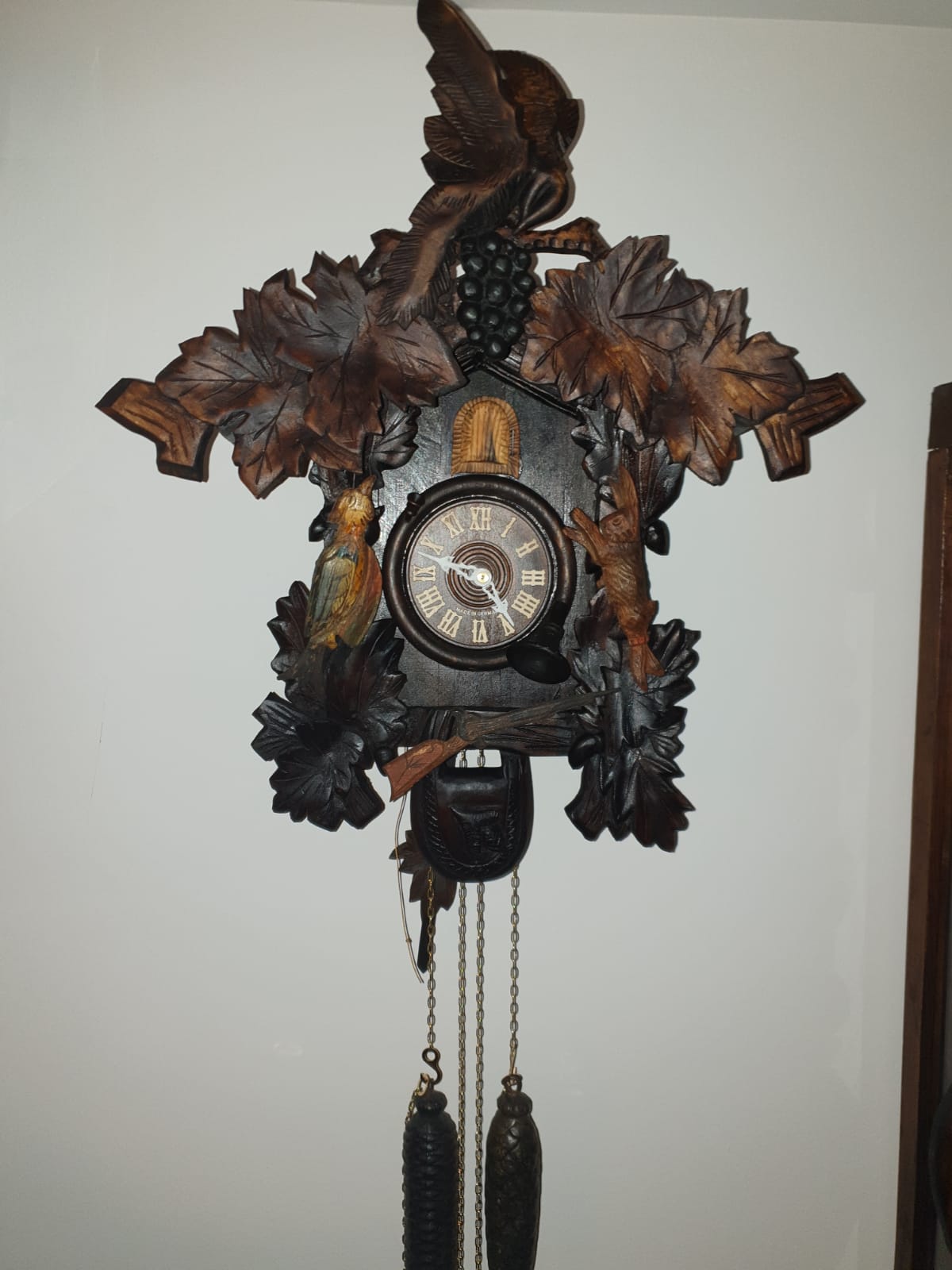 Kukulka z motywem myślwskim wymiary 52 cm × 43 cm, mechanizm umieszczony w skrzynce z drzewa orzecha włoskiego, mechanizm z naciągiem 8 dniowym, niemiecka REGULA 34,długość wahadła 23,5 cmCena 1900 zł Kategorie: Zegar kukułka