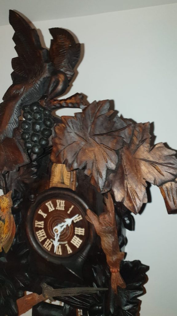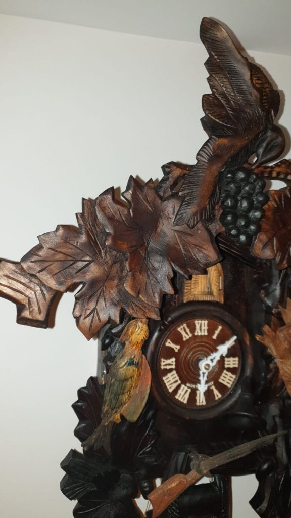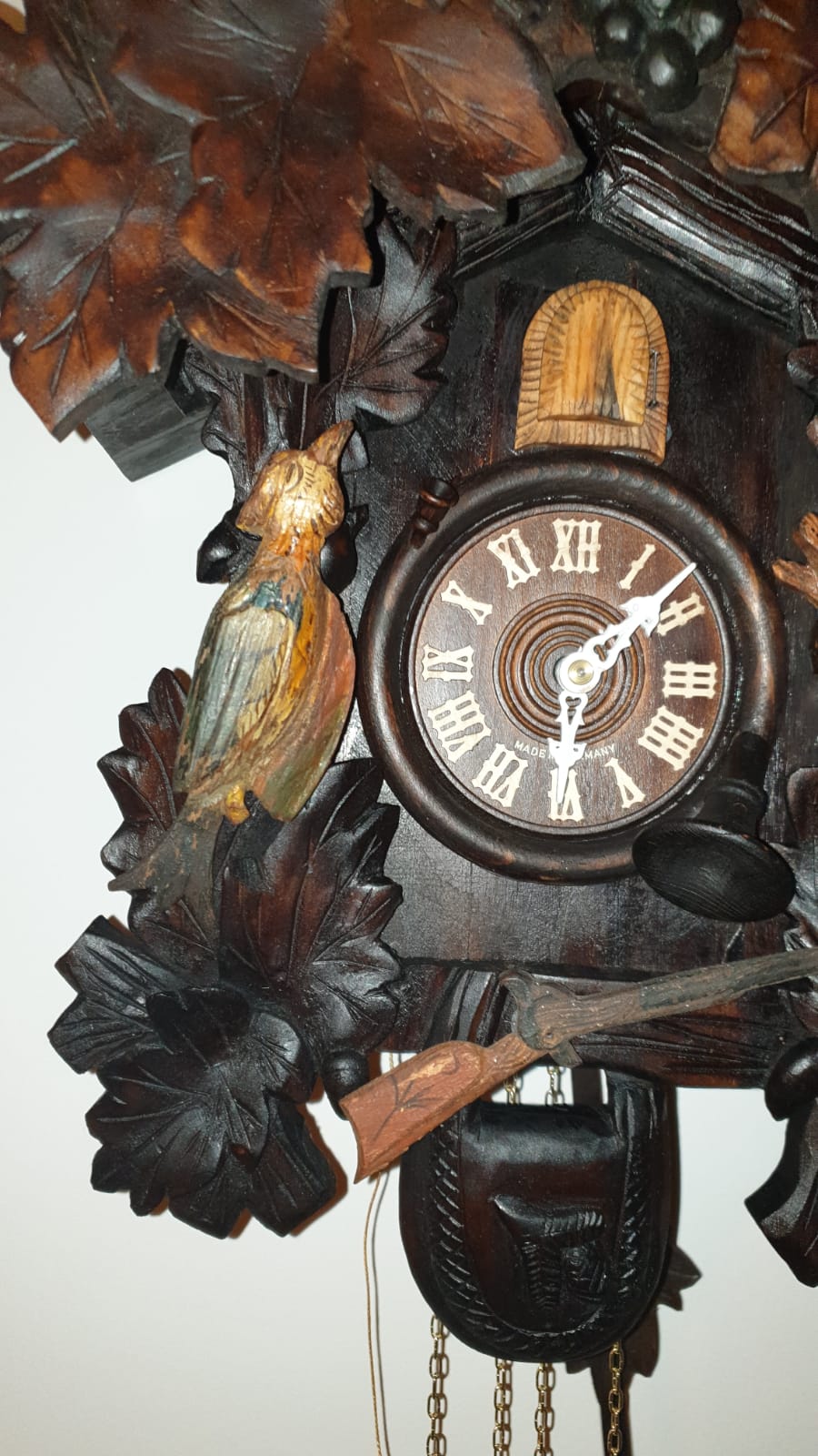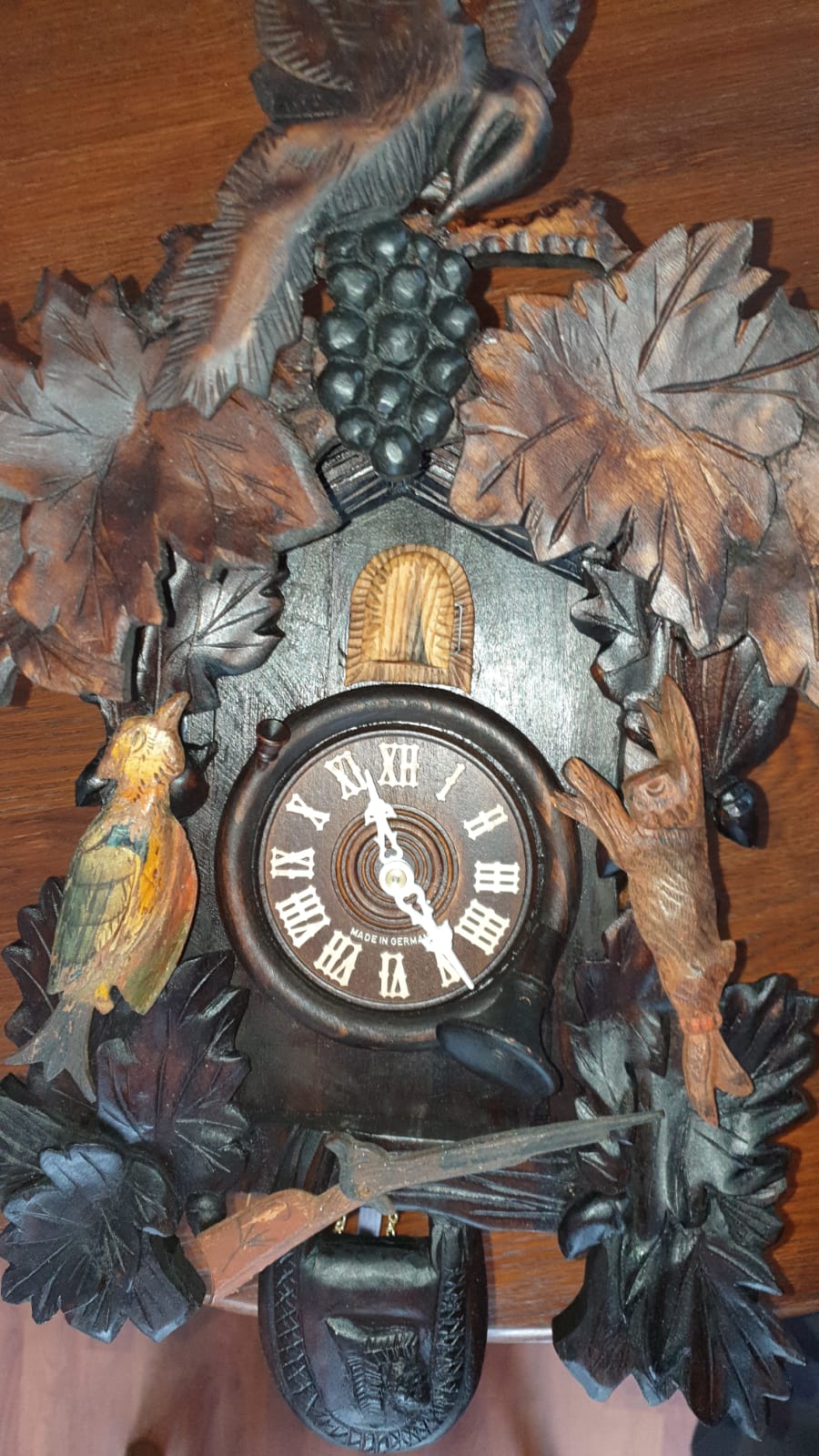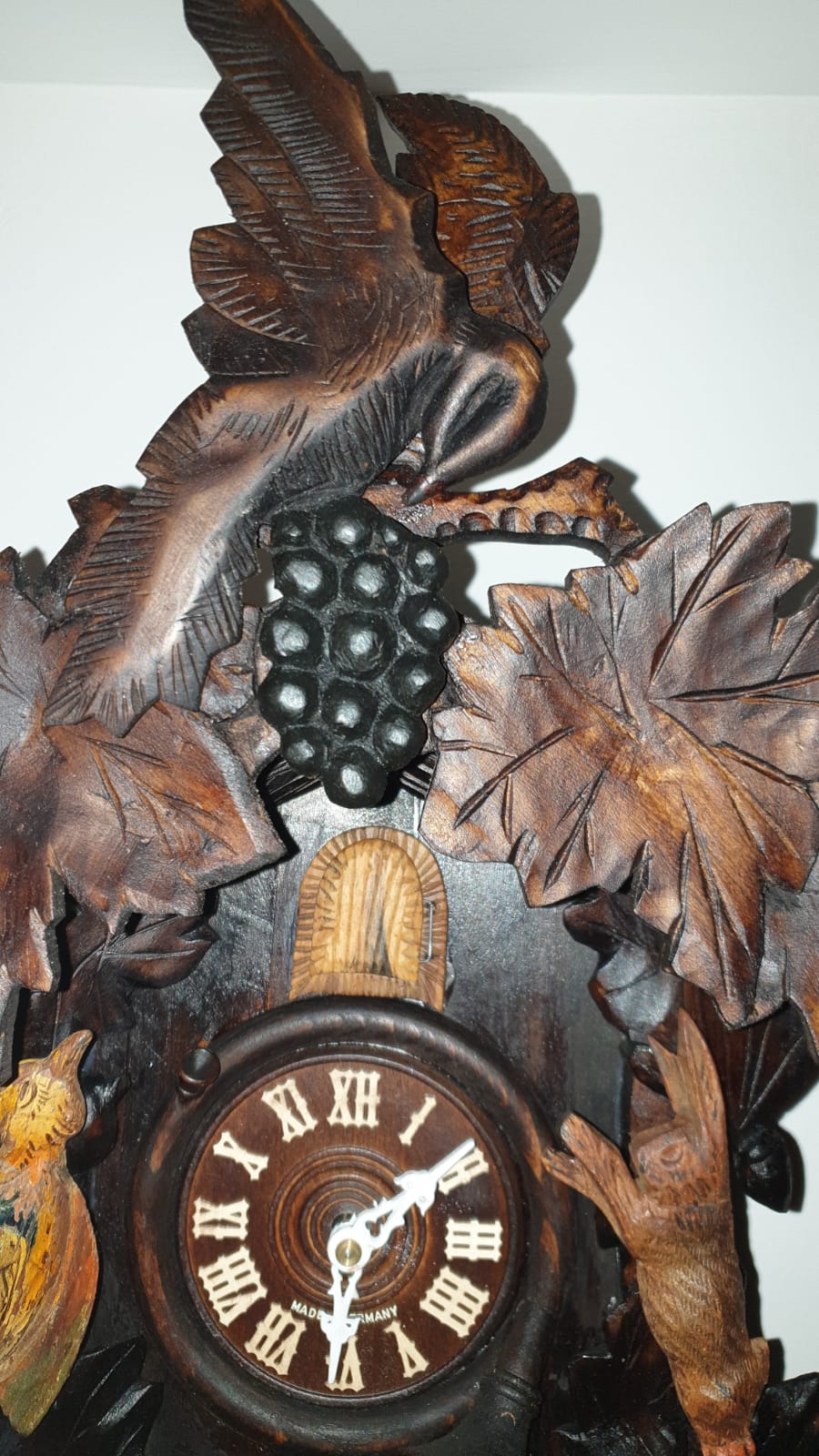 Kukulka z motywem myślwskim wymiary 52 cm × 43 cm, mechanizm umieszczony w skrzynce z drzewa orzecha włoskiego, mechanizm z naciągiem 8 dniowym, niemiecka REGULA 34,długość wahadła 23,5 cmCena 1900 zł Kategorie: Zegar kukułka