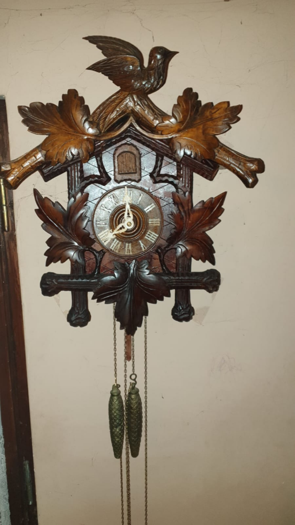 Duża rzeźba kukułki z naciągiem jednodniowym, stary mechanizm drewniaka (około 150 lat) jak na zdjęciach poniżej Wymiary: wysokość 70 cm, szerokość 49 cm, wahadło 28 cm CENA: 2100 zł